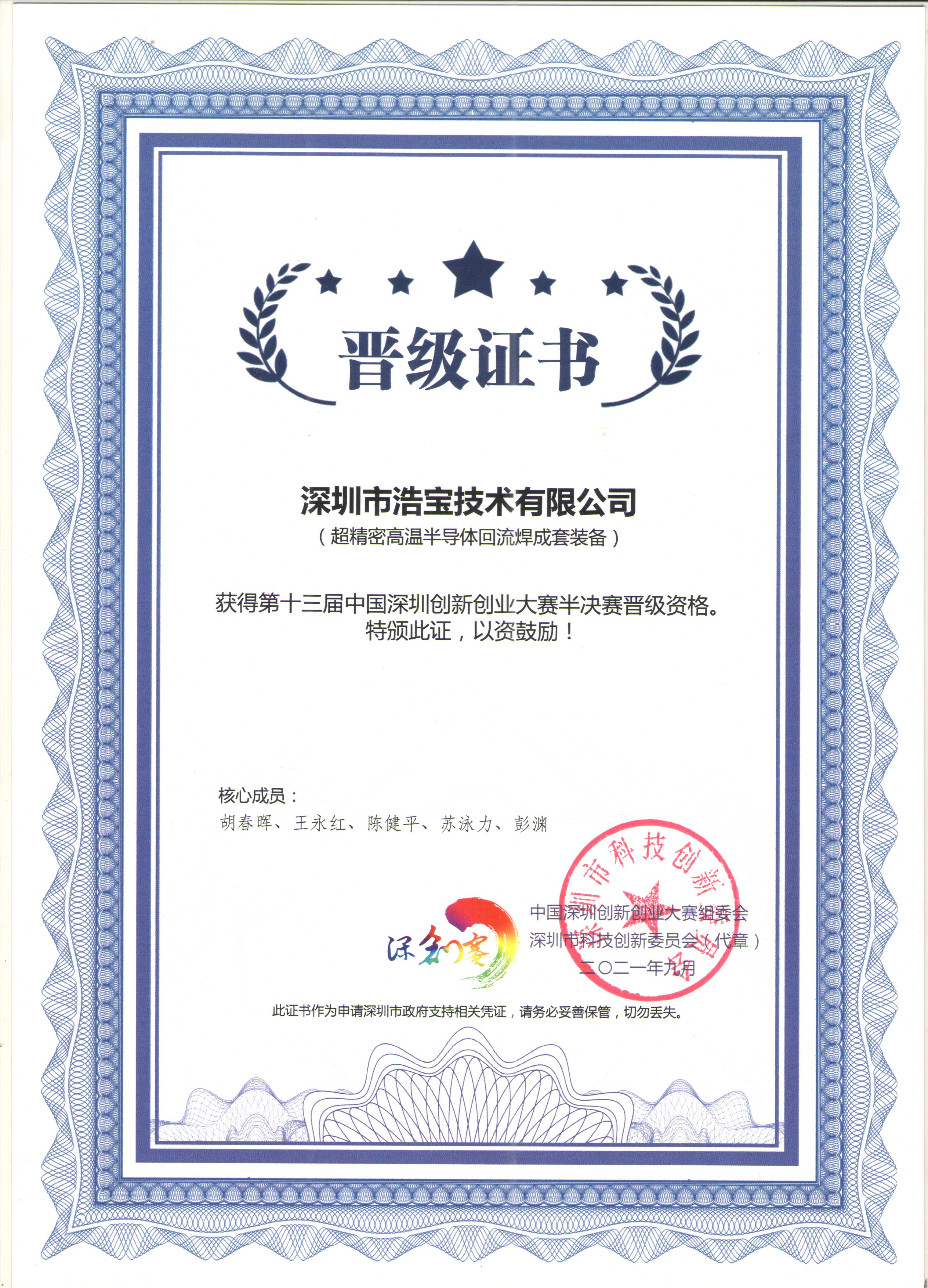 深圳浩宝获得深圳市第十三届创新创业大赛半决赛晋级证书